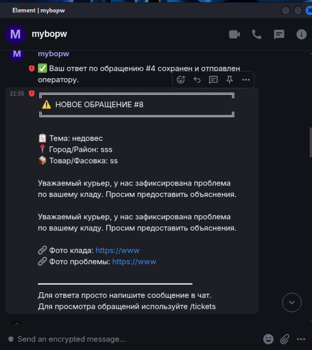 Курьер получает уведомление прямо в Element (безопасный мессенджер). Один клик — и вся информация перед ним:- Что произошло
