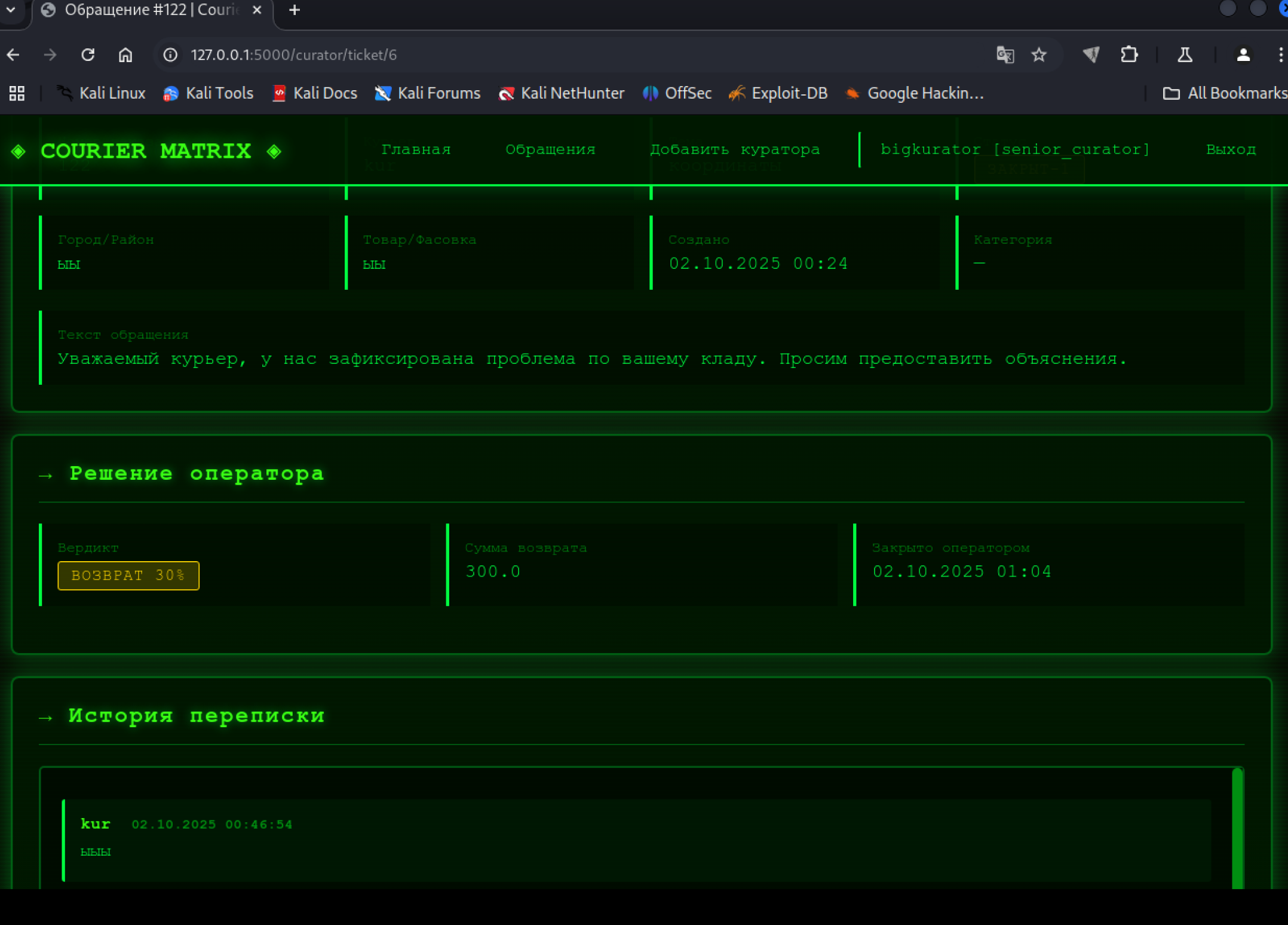 19:45 — Клиент жалуется: "Курьер потерял заказ"19:46 — Оператор создает обращение в системе