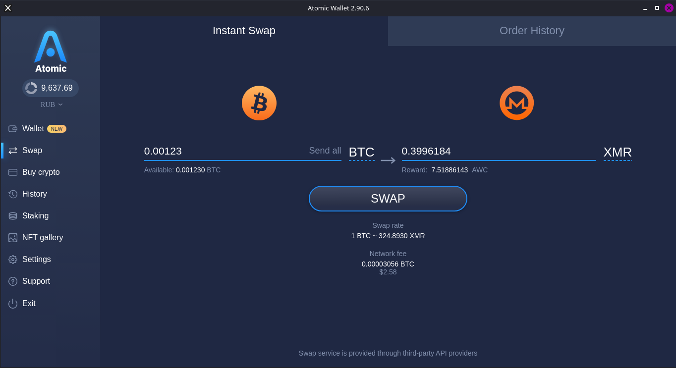 Далее когда уже поступили BTC на наш Atomic Wallet (этот кошелёк скажу довольно часто "тупит" и зачастую надо подтверждений в сети BTC более 1ого, лучше дождаться как минимум 5 подтвержений) заходим в раздел Swap и выбираем BTC - XMR. Указываем сумму которую хотим обменять, обратите внимание на Network fee - это комиссия за обмен. Ну и нажимаем SWAP. Смотрите иногда бывают моменты что сеть обмена перегружена и не даст сделать обмен, просто ждите или займитесь этим попозже. Бывают моменты что иногда надо и перезапустить кошелёк Atomic Wallet.